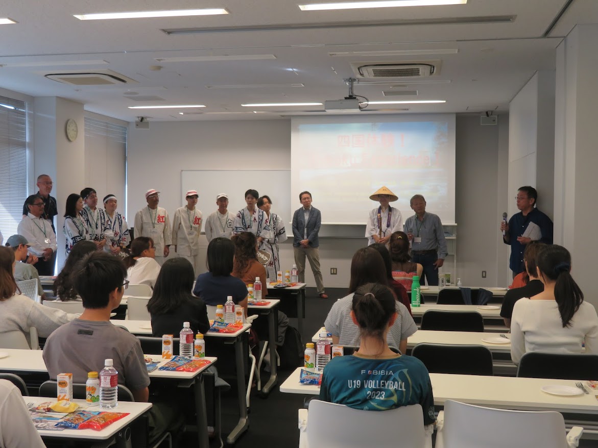 四国4県の稲門会が一丸となり、早稲田校友会四国ブロックとして10月18日、「中野国際寮WISH」(東京・中野)で四国PRイベントを開催しました。来日して間もない1年生を対象とし、四国の文化や魅力を体験してもらい、ファンになってもらうことを目的とした企画です。香川の遍路や徳島の阿波踊り、愛媛の野球拳などの伝統文化紹介に加え、白味噌あん餅雑煮や讃岐うどん、芋けんぴといった四国の“ソウルフード”も振る舞われました。多くの学生に四国の多彩な魅力を存分に感じてもらえる機会となりました。